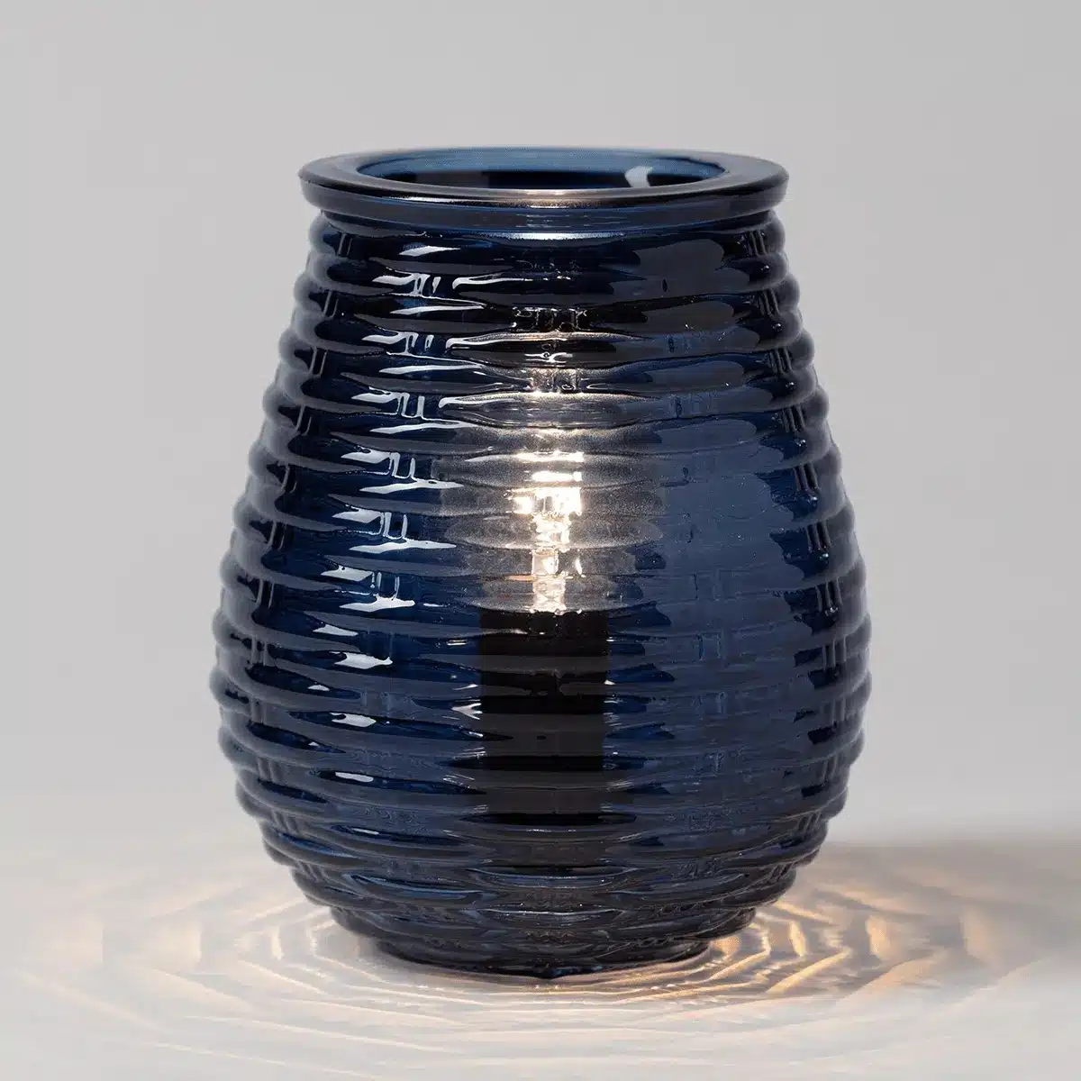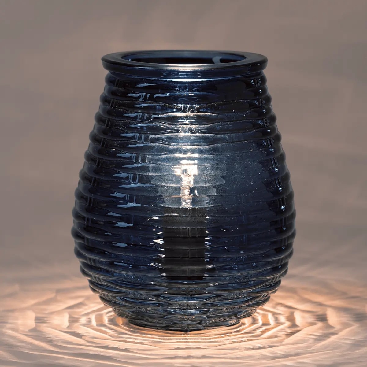 Borrowing style from woven coastal baskets, this hand-blown glass Warmer exudes a relaxed seaside vibe, a warm glow and rippled light on nearby surfaces when lit.