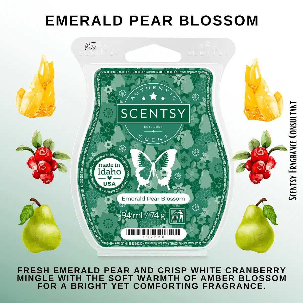 “Emerald Pear Blossom Scentsy Bar – Fresh emerald pear and crisp white cranberry mingle with the soft warmth of amber blossom for a bright yet comforting fragrance.”