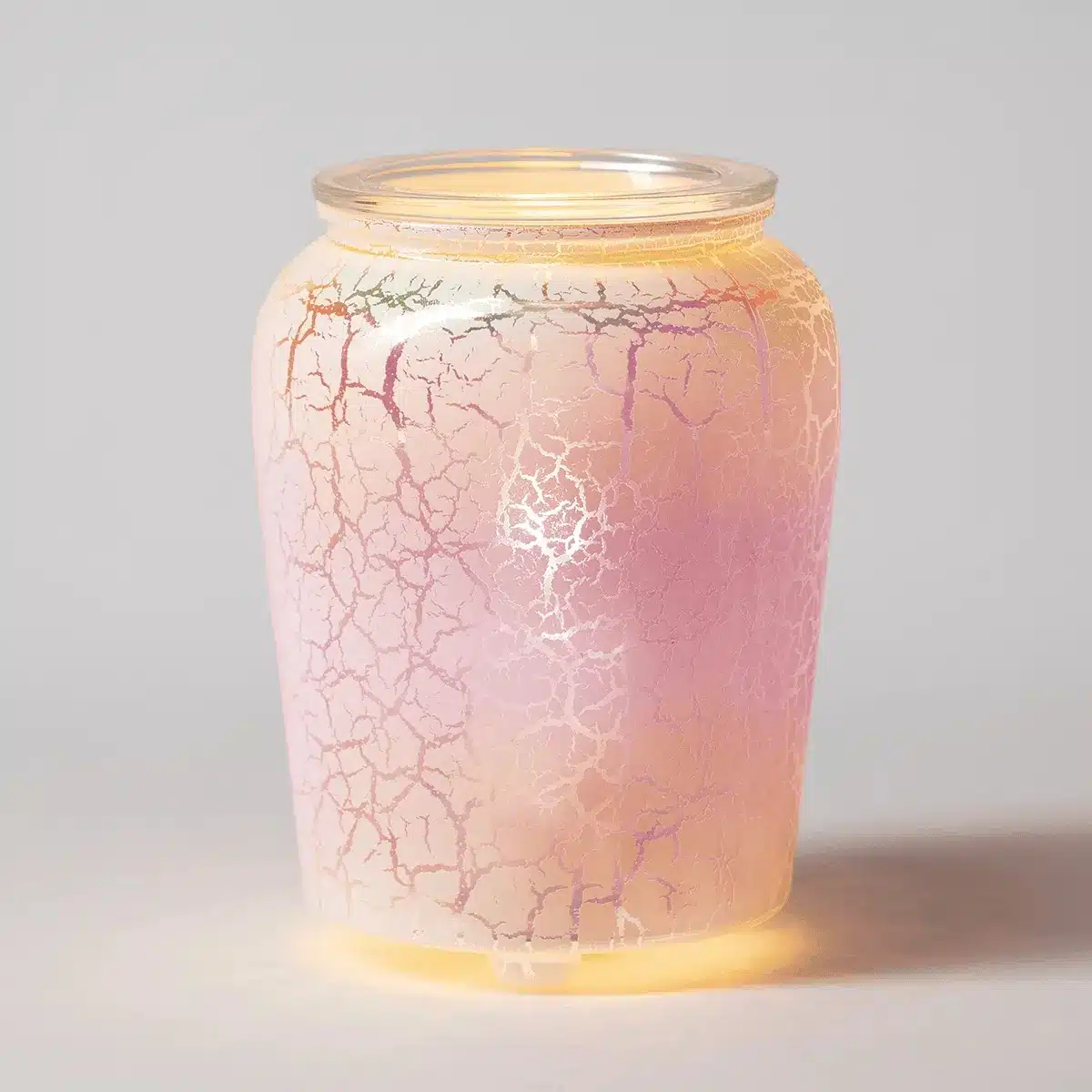 An electroplating technique crackles across an iridescent finish, making each Iridescent Rainbow Warmer unique. A bright rainbow really shines when this Warmer is lit, casting light and color onto nearby surfaces.