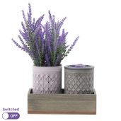Side-by-side in a rustic wood box, a lavender bouquet and warmer set the scene for tranquility. Includes four faux bunches of lavender. Due to the finish of the wood, each box may have slight variations.