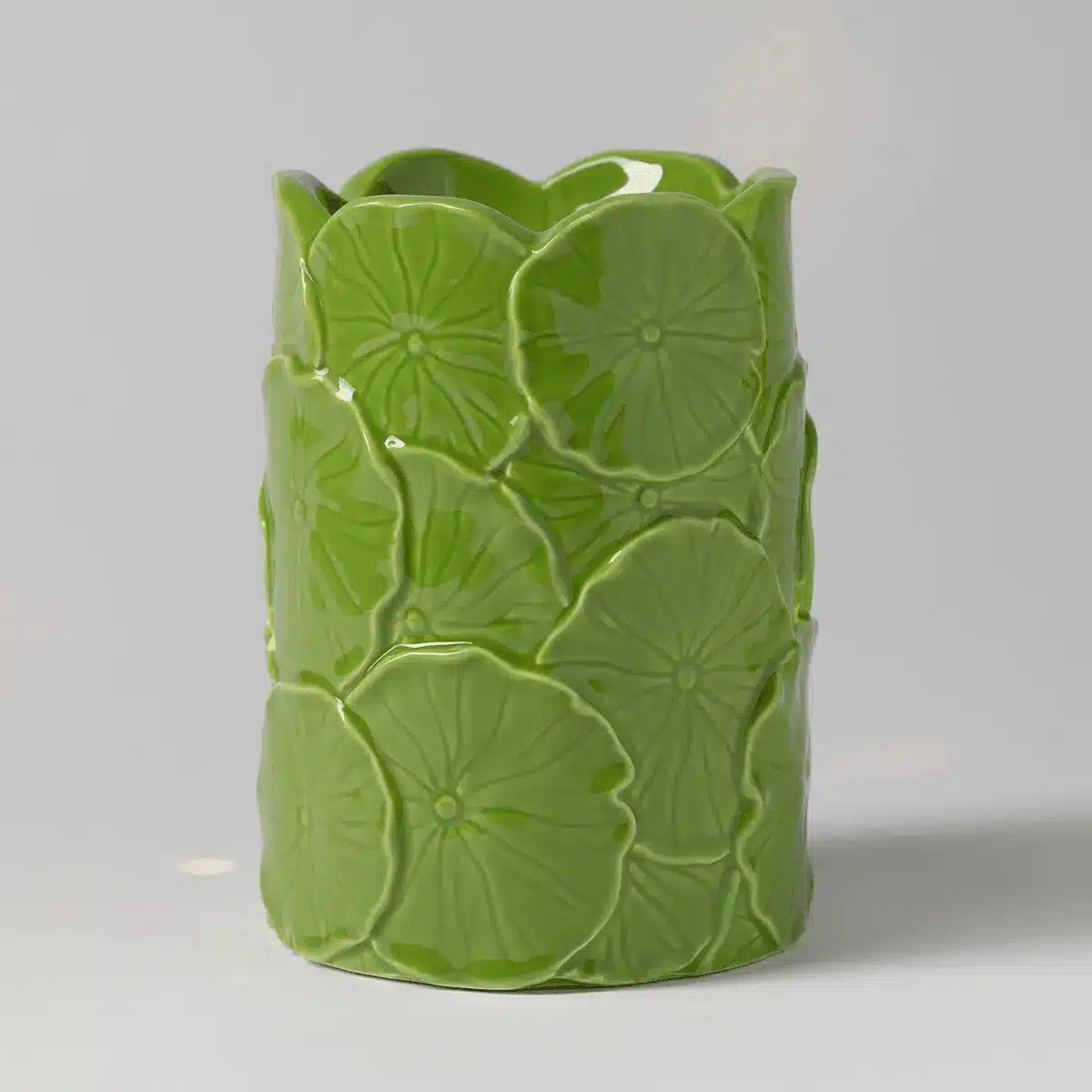 Layered lily pads echo the organic, playful beauty of nature. The dimensional look, carefully crafted details and bright color bring a burst of garden freshness to any space. The sculpted lily pad design carries over into the molded wax dish.