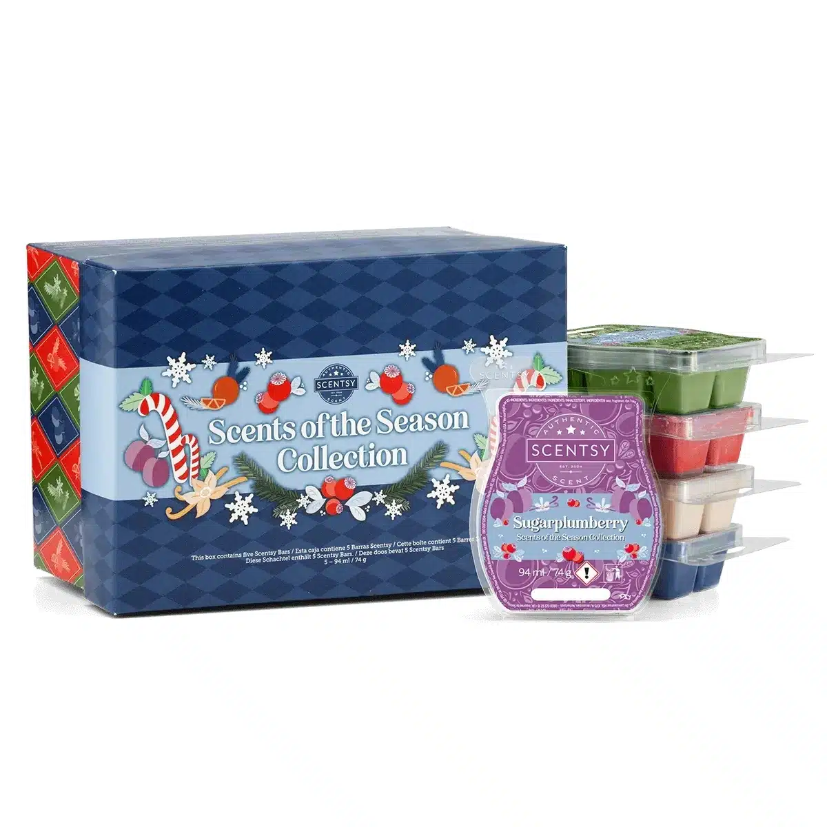 Includes all five Scents of the Season Scentsy Bars (one bar in each fragrance), packaged in a festive gift box!